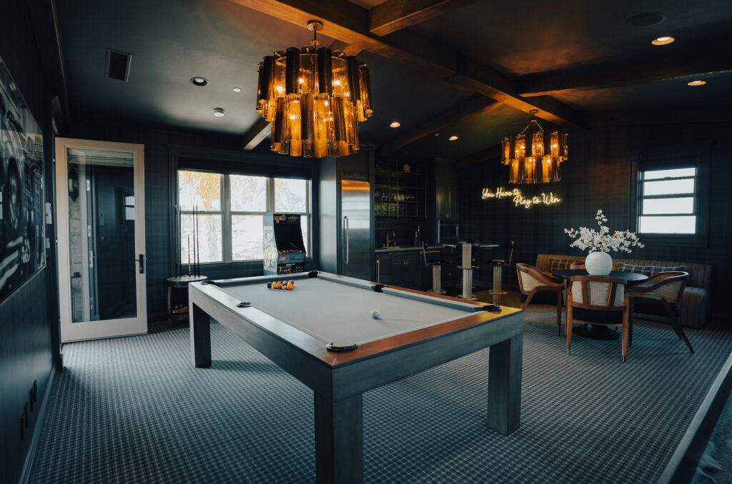 “Another unexpected touch,” Starr says. “We love adding in something personal like a neon sign that says, ‘You Have to Play to Win,’ which is how the owner lives his life.”