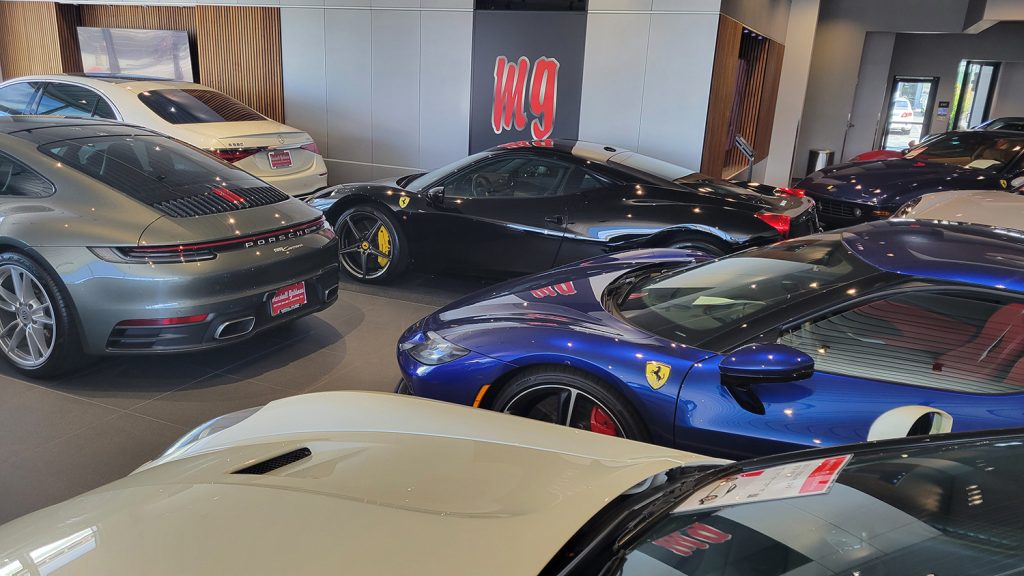 There are Porsche 911 Carreras alongside Ferraris, a Mercedes Benz nestled near a BMW, and even a McLaren facing out towards Coast Highway. These are all low mileage, highly prized vehicles ready to be sold to car collectors around the country.