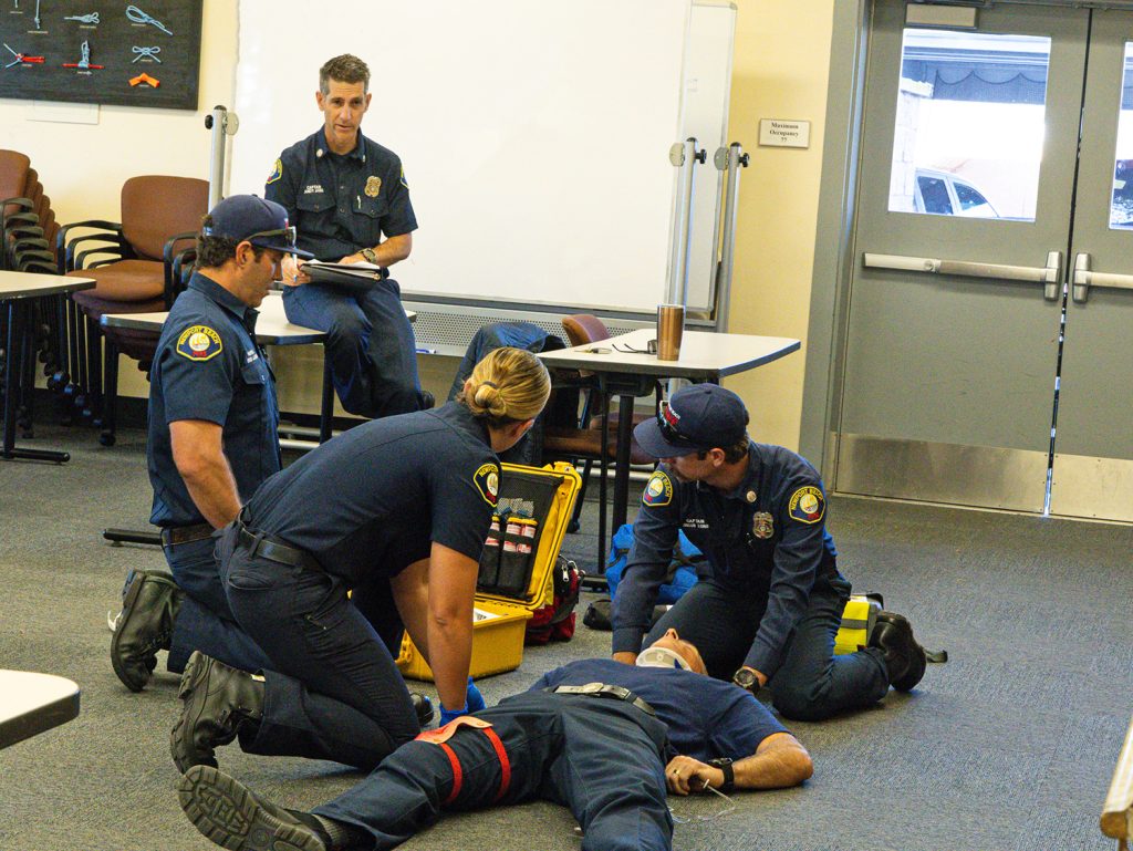 Every fire fighter is a trained Emergency Medical Technician, able to competently attend to less serious physical injuries, Thompson explained. California mandates that EMTs and paramedics undergo retraining every two years; EMTs receive 24-hours of training, while paramedics attend 448 hours in that time frame.